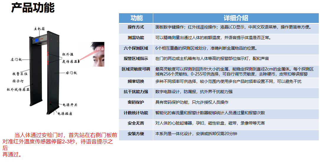 進口雙探頭專業測溫門:有機將紅外測溫,采用進口醫學專用紅外雙探頭,上下兩個探頭可以調整,更有利檢測成年人和小朋友,先進行紅外人體測溫,真人發音報警,提示體溫異常,有效防止規模性疾病傳染;